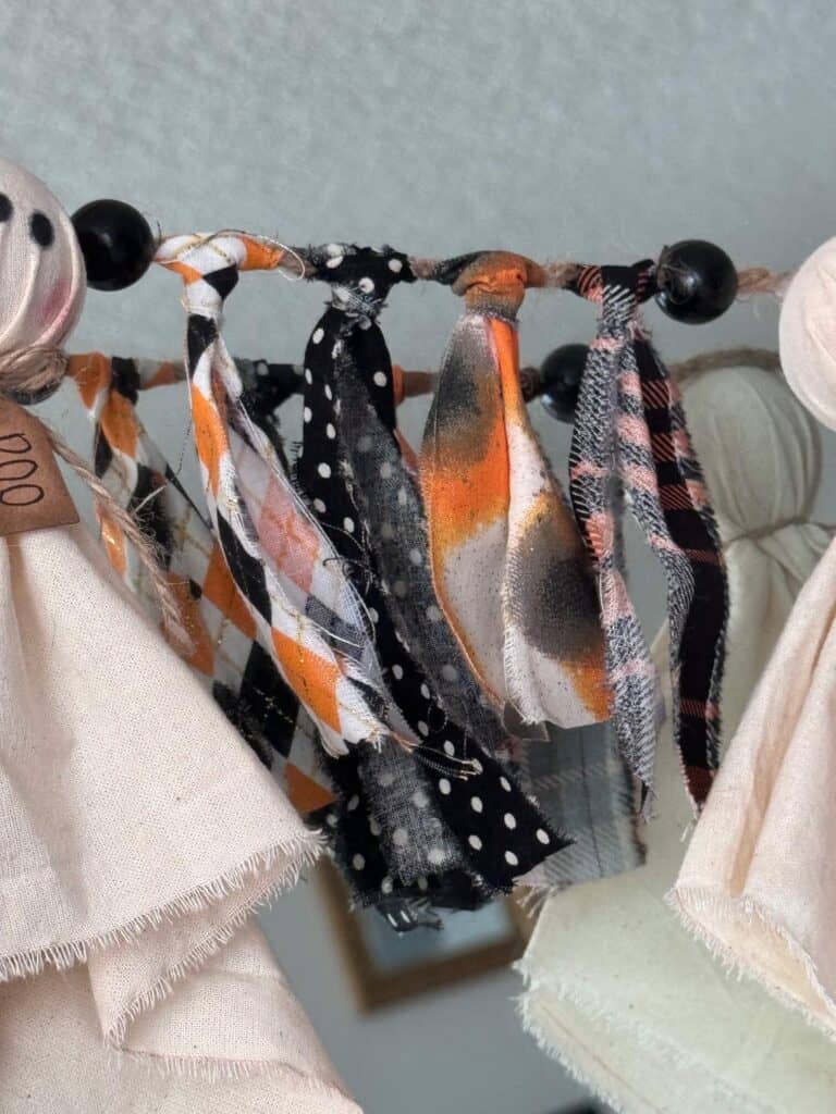 Start by tying on the first 4 pieces of fabric, sliding it all the way down to the far left end of the twine, then add a black wood bead, and then use hot glue to glue the twine to the back of the 1st ghosts head (the one that says “THAT’S”). Then add another black wood bead, tie on 4 more pieces of fabric, and then the ghost that says “BOO”, and so on until you get all three ghosts on and all 4 groups of fabric.